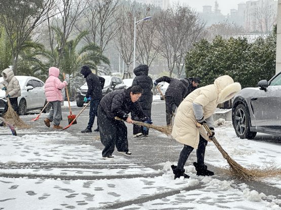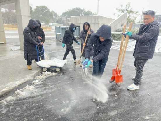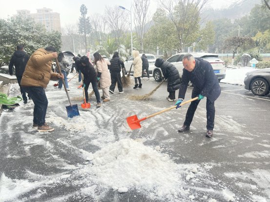 寒风凛冽中,办领导带头挥舞铁锹铲雪开路,干部职工紧随其后、分工协作:有人铲除厚积雪,有人撒布融雪盐加速化冰,有人铺设草垫防滑,现场一派热火朝天的忙碌景象。