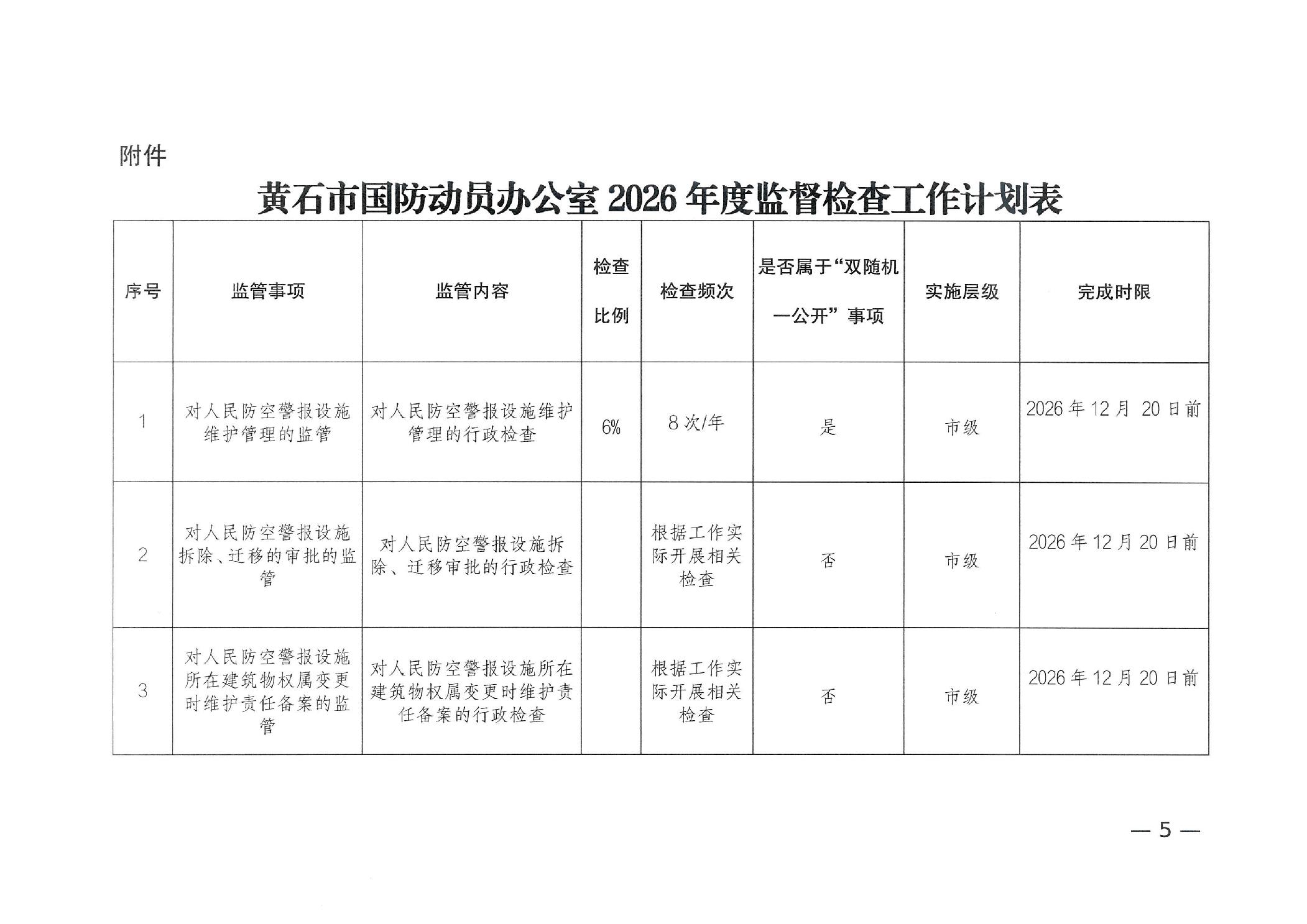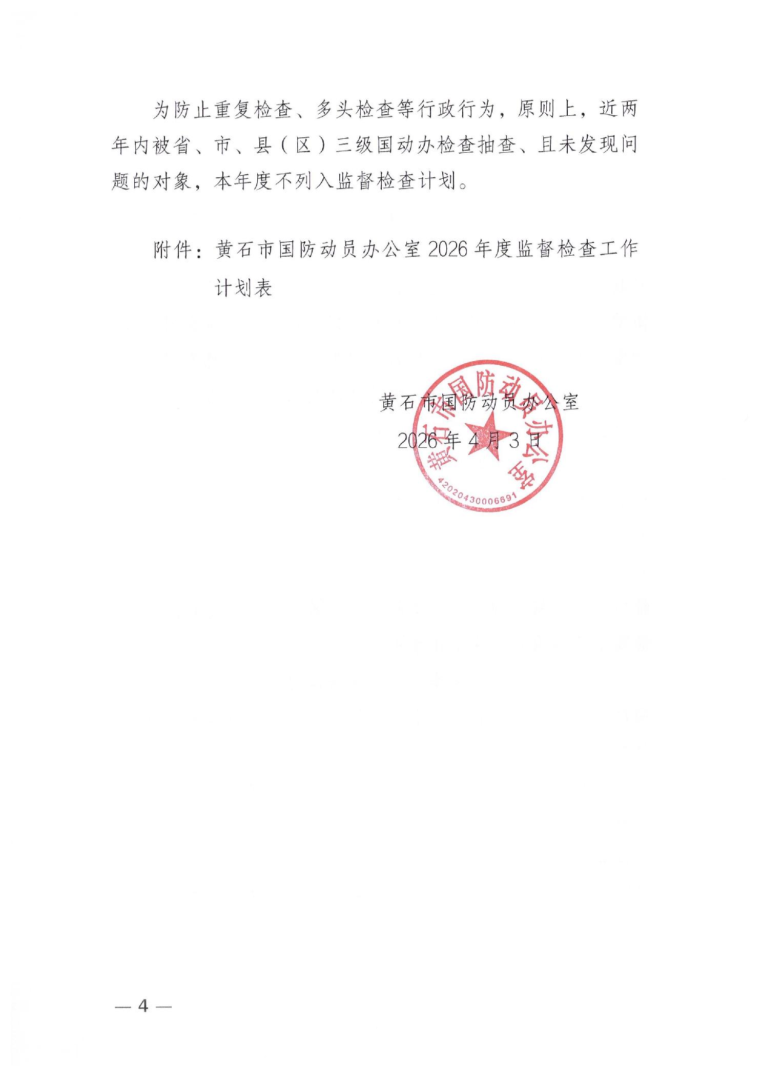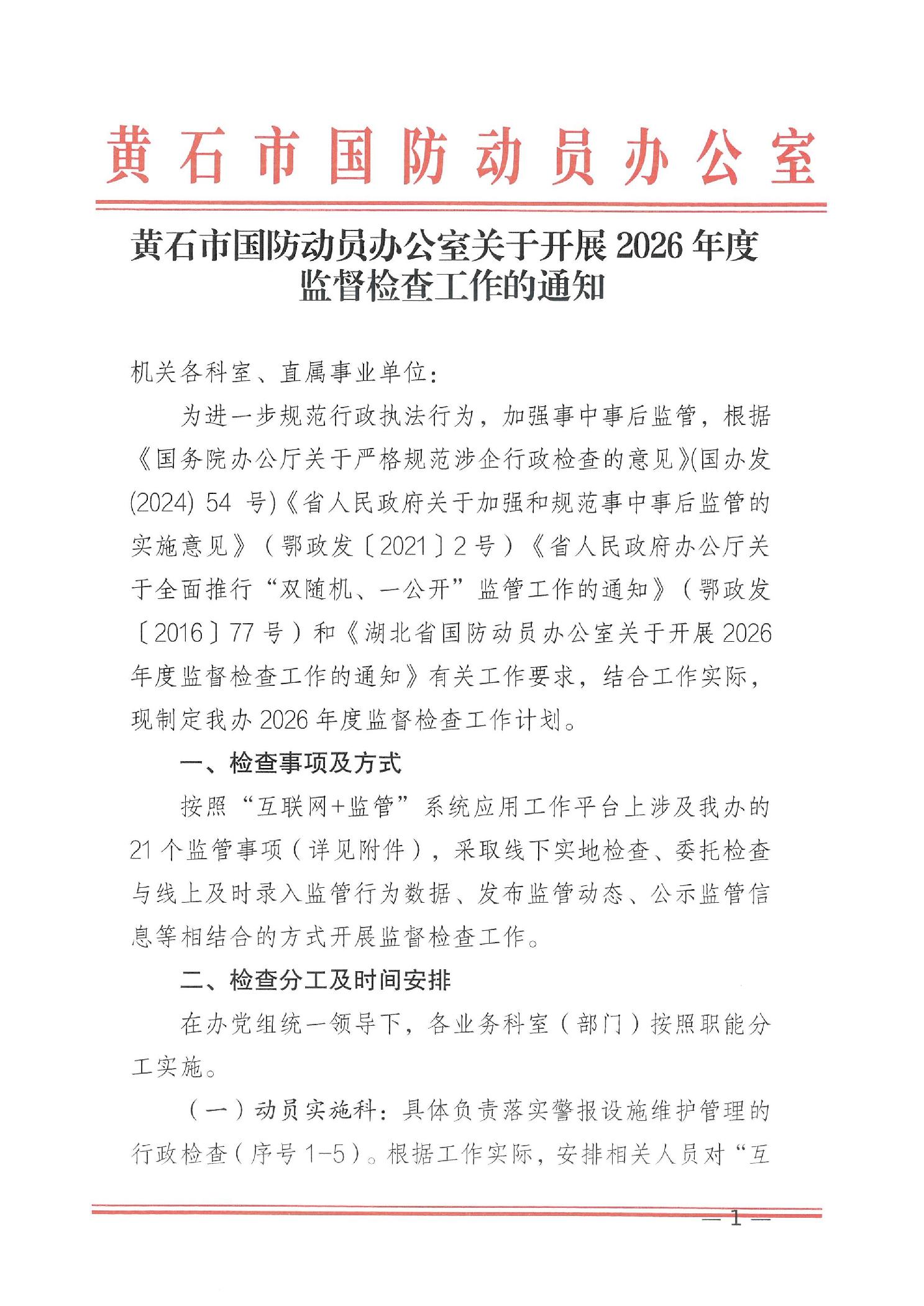 黄石市国防动员办公室关于开展2026年度 监督检查工作的通知